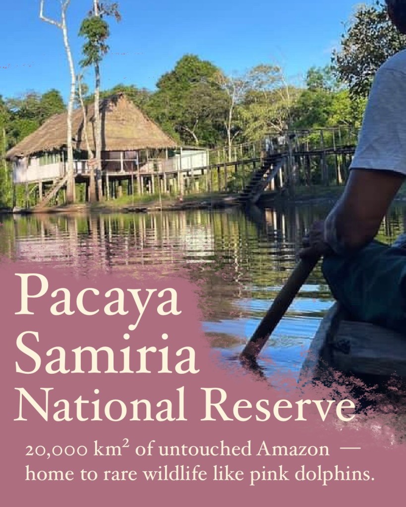 The Pacaya Samiria National Reserve is one of the largest protected areas in Peru, spanning over 20,000 square kilometers of pristine Amazon rainforest. It is home to an incredible diversity of wildlife, including over 500 species of birds, 132 types of mammals, and numerous species of fish, reptiles, and amphibians. Known as the “Jungle of Mirrors,” the reserve’s reflective waterways create stunning visual effects, and its rich ecosystems support iconic Amazon species such as pink dolphins, jaguars, and manatees.