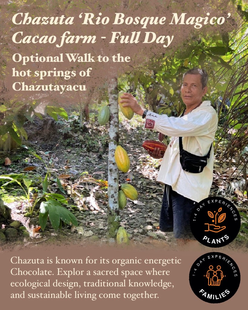 Río Bosque Mágico is more than an organic cacao farm—it is a living example of regenerative agriculture and ancestral wisdom in action. Here, permaculture is not just a method but a way of life, where cacao trees and medicinal plants thrive in harmony with native biodiversity, and every element of the farm—from compost to chocolate—is part of a balanced, self-sustaining ecosystem. This immersive tour invites you to explore a sacred space where ecological design, traditional knowledge, and sustainable living come together to nurture both land and spirit.